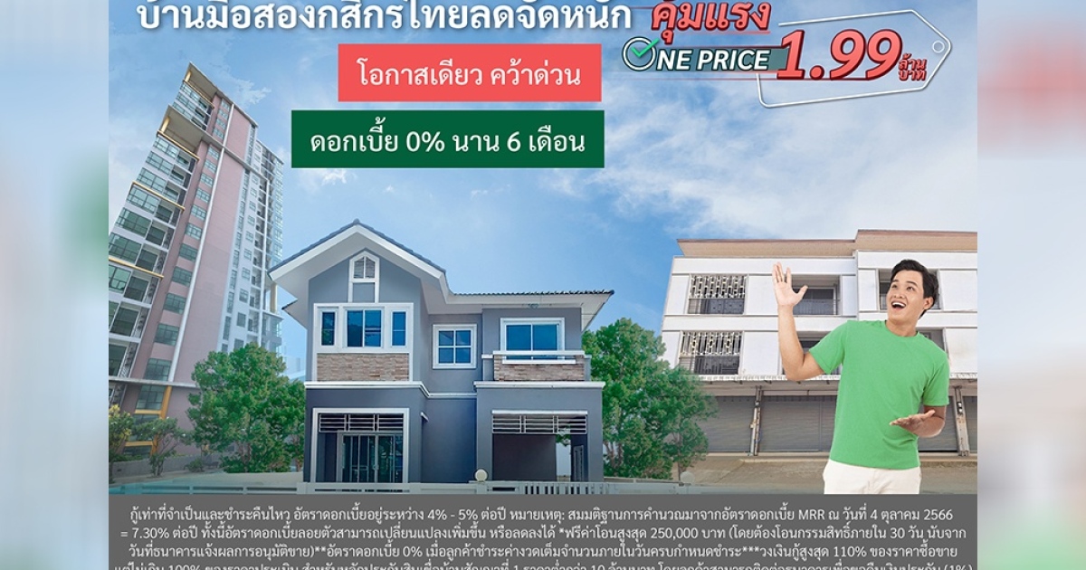 บ้านมือสองกสิกรไทยลดจัดหนัก คุ้มแรง One Price 1.99 ล้านบาท โอกาสเดียว คว้าด่วนฟรีโอนสูงสุด 250,000 บาท ดอกเบี้ย 0% นาน 6 เดือน