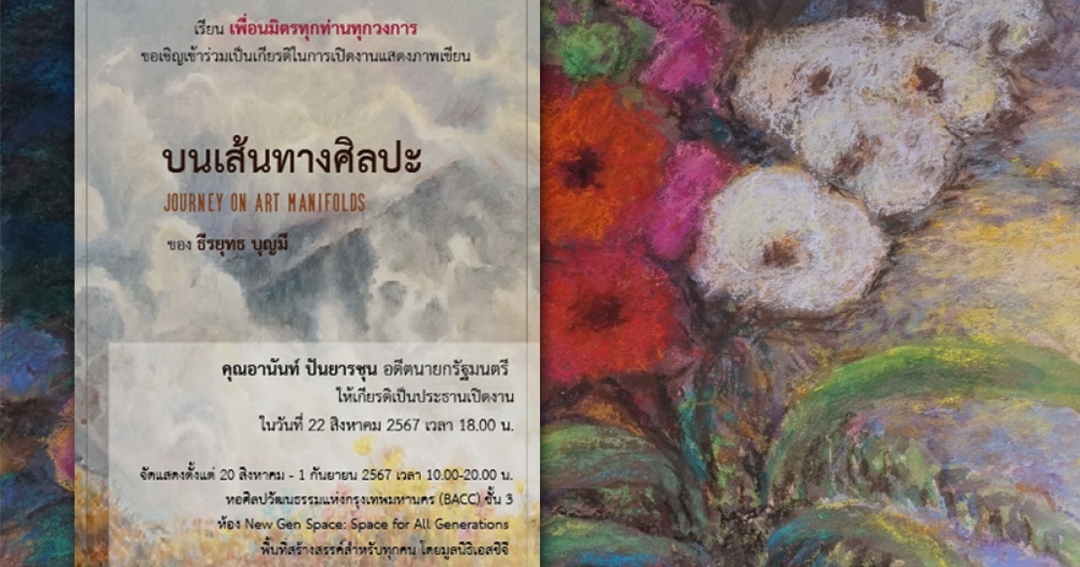 นายธีรยุทธ บอกถึงที่มาของการจัดแสดงภาพวาด “บนเส้นทางศิลปะ: Journey on Art Manifolds” ว่า เป็นคนชื่นชอบศิลปะมาตั้งแต่เด็กและได้ทำงานศิลปะ 30 ปี โดยได้ใช้เวลาในการเขียนภาพวาด ทั้งเขียนสีน้ำมันและสีพาสเทล มาอย่างต่อเนื่อง และพบว่าการสร้างสรรค์หรือนวัตกรรมเป็นส่วนหนึ่งของ DNA มนุษย์ ไม่ว่าจะใช้ในทิศทางศิลปะหรือวิทยาศาสตร์ มนุษย์สร้างสรรค์วิทยาศาสตร์เพื่อเข้าใจโลก ขณะที่ทำงานศิลปะเพื่อเข้าใจตัวเองเข้าใจความรู้สึกที่ตัวเองมีต่อโลกและเพื่อนมนุษย์ด้วยกันซึ่งทั้งสองด้านล้วนต้องอาศัยการทำความเข้าใจสิ่งที่ตัวเองจะศึกษา สังเกต วิเคราะห์ ทดลอง ลงมือทำ แก้ไข เปลี่ยนแปลง ลองผิดลองถูก ก่อนนำไปสู่บทสรุปถ้าข้อสรุปตรงกับกฎเกณฑ์ของโลกก็เป็นทฤษฎีทางวิทยาศาสตร์ ถ้าผลงานสื่อสารความหมาย ความงาม อารมณ์อย่างสอดคล้องกับจริตของผู้คนแต่ละยุคสมัย ก็จะเป็นผลงานศิลปะ