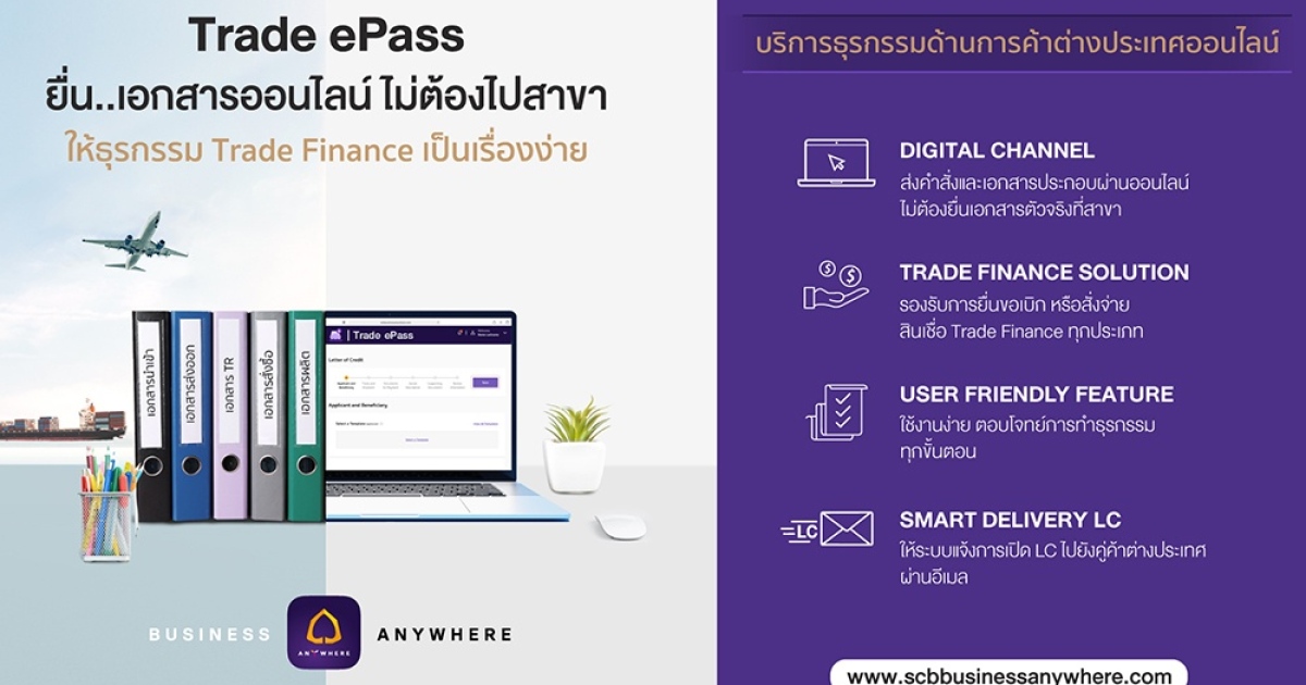 ธนาคารไทยพาณิชย์ เดินหน้ายกระดับประสบการณ์ดิจิทัลเพื่อลูกค้าธุรกิจ เปิดตัวบริการใหม่ “Trade ePass บริการธุรกรรมด้านการค้าต่างประเทศออนไลน์” บนแพลตฟอร์ม SCB Business Anywhere ทำรายการผ่านออนไลน์ได้ทุกที่ ทุกเวลา ไม่ต้องยื่นเอกสารตัวจริง* ไม่ต้องเดินทางติดต่อสาขาธนาคาร ประหยัดเวลาและต้นทุน สร้างประสิทธิภาพการทำงานและขีดความสามารถในการแข่งขันให้แก่ภาคธุรกิจไทย ทั้งนี้ บริการ Trade ePass รองรับการทำธุรกรรมการค้าต่างประเทศ (Trade Finance) ทุกประเภท การชำระ และบริการด้านข้อมูลบัญชี พร้อมบริการ Smart Delivery ให้ระบบแจ้งการเปิดเลตเตอร์ออฟเครดิต (LC) ไปยังคู่ค้าต่างประเทศผ่านอีเมล มั่นใจด้วยมาตรฐานความปลอดภัยระดับโลก ที่สามารถตรวจสอบสถานะคำสั่งได้เรียลไทม์ตลอด 24 ชั่วโมง