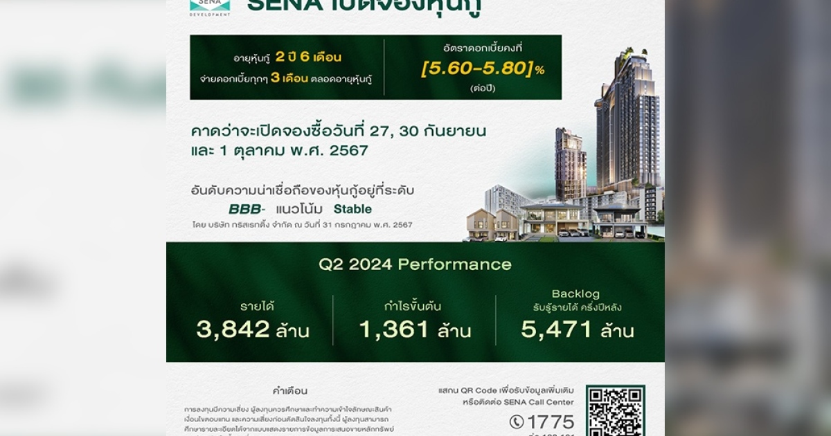 ทั้งนี้ เพื่อรองรับการขยายตัวของบริษัท และเพื่อเตรียมเงินทุนไว้สำหรับการชำระคืนหุ้นกู้ที่จะครบกำหนด ภายในเดือนตุลาคม 2567 โดยการเสนอขายหุ้นกู้ครั้งนี้ SENA คาดว่าจะได้รับการตอบรับที่ดีจากผู้ลงทุนทั่วไปและผู้ลงทุนสถาบันที่มีความสนใจเหมือนดังเช่นทุกครั้งที่ผ่านมา เนื่องจากหุ้นกู้ของ SENA ถือได้ว่าเป็นทางเลือกที่สามารถตอบโจทย์ผู้ที่มองหาโอกาสในการลงทุนหุ้นกู้ที่ออกโดยบริษัทที่มีความมั่นคง มีสถานะทางการเงินที่ดี โดยหุ้นกู้ครั้งนี้ได้รับการจัดอันดับความน่าเชื่อถือจาก บริษัท ทริสเรทติ้ง จำกัด เมื่อวันที่ 31 กรกฎาคม 2567 ที่ระดับ “BBB-” แนวโน้มอันดับเครดิต “คงที่” ซึ่งถือเป็นระดับ Investment Grade หรือเรียกว่าระดับที่สามารถลงทุนได้