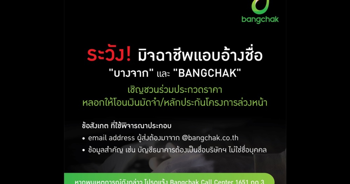 บริษัทฯ พบว่ามีกลุ่มมิจฉาชีพแอบอ้างใช้ชื่อ “บางจาก” และ “BANGCHAK” และ ตราสัญลักษณ์บางจาก รวมทั้งที่อยู่แอบอ้างจากสถานที่ตั้งจริง สร้างความเข้าใจผิดว่ามีความเกี่ยวข้องกับบริษัทฯ เพื่อหลอกลวงและชักชวน ให้ซัพพลายเออร์เข้าร่วมประกวดราคา โดยระบุให้โอนเงินมัดจำหรือหลักประกันโครงการก่อนล่วงหน้า โดยไม่มีการแจ้งชื่องานหรือให้รายละเอียดโครงการแต่อย่างใด ซึ่งไม่เป็นไปตามกระบวนการบริหารจัดการของบริษัทฯ