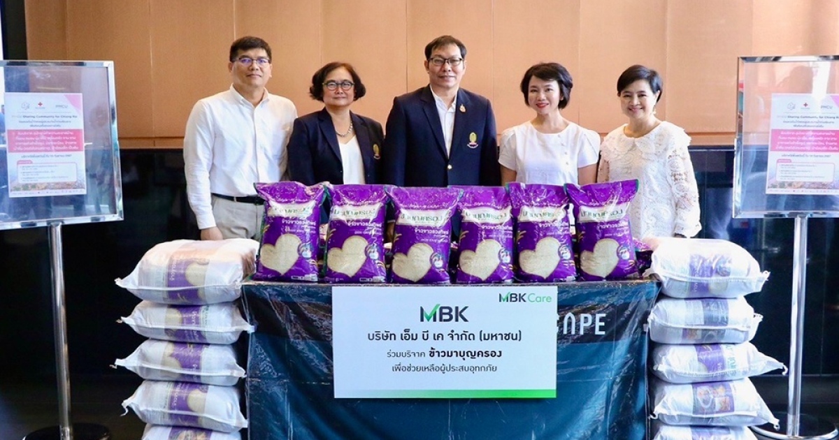 นางสาวพุทธชาด ศรีนิศากร ประธานเจ้าหน้าที่บริหารสายการตลาด บริษัท เอ็ม บี เค จำกัด (มหาชน) (ที่ 4 จากซ้าย) พร้อมด้วย นางสาวศตกมล วรกุล ผู้อำนวยการอาวุโสฝ่ายสื่อสารองค์กร บริษัท อินเทลลิเจ้นท์ ครีเอทีฟ แอนด์ มาร์เก็ตติ้ง จำกัด (ที่ 5 จากซ้าย) มอบข้าวสารมาบุญครอง เพื่อร่วมแบ่งปันน้ำใจช่วยผู้ประสบภัยน้ำท่วมเชียงราย และการฟื้นฟูภายใต้แนวคิด MBK Care ผ่าน โครงการ PMCU Sharing Community For Chiang Rai โดยจุฬาลงกรณ์มหาวิทยาลัย เนื่องจากสถานการณ์น้ำท่วมในพื้นที่ภาคเหนือ ส่งผลกระทบสร้างความเสียหายเป็นวงกว้าง และมีผู้ประสบภัยจำนวนมากที่ยังรอคอยความช่วยเหลืออย่างต่อเนื่อง โดยมี รศ.ดร.สิทธิเดช พงศ์กิจวรสิน ผู้รักษาการรองอธิการบดี กำกับดูแลด้านการจัดการทรัพย์สิน (ที่ 3 จากซ้าย) เป็นผู้รับมอบ ณ Siam Scape เมื่อเร็วๆ นี้