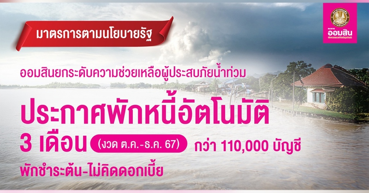 ออมสิน ขานรับนโยบายรัฐช่วยลูกหนี้ประสบภัยน้ำท่วม ประกาศพักหนี้อัตโนมัติ 3 เดือน ให้พักชำระเงินต้น ไม่คิดดอกเบี้ย จำนวนกว่า 110,000 บัญชี งวด ต.ค.-ธ.ค. 67