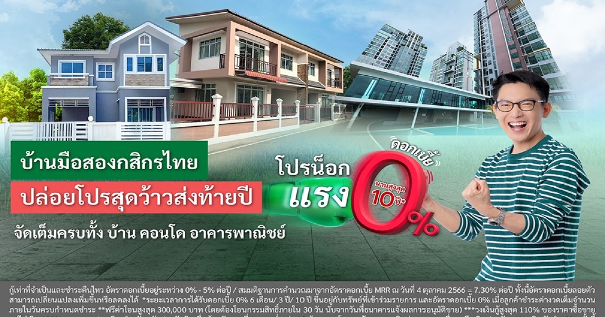 บ้านมือสองกสิกรไทยปล่อยโปรสุดว้าวส่งท้ายปี “โปรน็อกแรง ดอกเบี้ย 0%” นานสูงสุด 10 ปี จัดเต็มครบทั้ง บ้าน คอนโด อาคารพาณิชย์