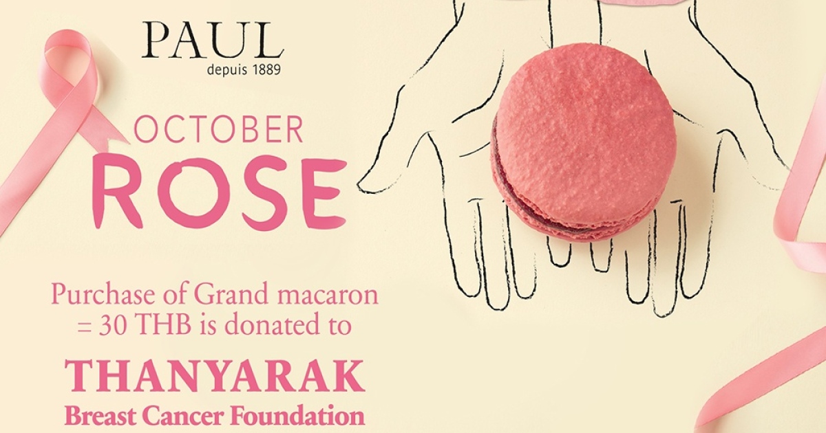 โดยทุกๆ การซื้อ Grand Macaron จำนวน 1 ชิ้น (ไม่จำกัดรสชาติ) ตลอดเดือนตุลาคม 2567 นี้ จะเท่ากับการร่วมบริจาค 30 บาท ให้กับมูลนิธิถันยรักษ์ฯ ในการนำจัดหาอุปกรณ์ทางการแพทย์ เพื่อขยายโอกาสให้ผู้หญิงไทยเข้าถึงการตรวจคัดกรองมะเร็งเต้านมมากยิ่งขึ้น ลูกค้าสามารถร่วมสนับสนุนแคมเปญ October Rose ได้ตั้งแต่ วันที่ 1-31 ตุลาคม 2567 ที่ร้าน PAUL ทุกสาขา และช่องทาง Delivery”
