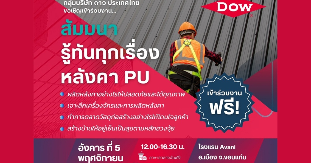 เมื่อวันที่ 16 ตุลาคม 2567 กลุ่มบริษัท ดาว ประเทศไทย (Dow) ขอเชิญผู้ผลิตหลังคาเมทัลชีทพียู ผู้รับเหมา และช่างก่อสร้าง เข้าร่วมงานสัมมนาฟรี “รู้ทันทุกเรื่องหลังคาพียู” โดยรวมผู้เชี่ยวชาญหลากหลายด้านในวงการก่อสร้างมาให้ความรู้เกี่ยวกับนวัตกรรมวัสดุฉนวน PU สำหรับหลังคาเมทัลชีท การผลิตหลังคาที่ปลอดภัยและได้คุณภาพ ข้อมูลการทำตลาดวัสดุก่อสร้างให้มีประสิทธิภาพ เทคนิคการติดตั้งหลังคาอย่างปลอดภัย และแนวทางการสร้างบ้านให้อยู่เย็นเป็นสุขตามหลักฮวงจุ้ย โดยจัดขึ้นในวันอังคารที่ 5 พฤศจิกายน 2567 เวลา 12.00-16.30 น. ณ โรงแรม Avani ขอนแก่น