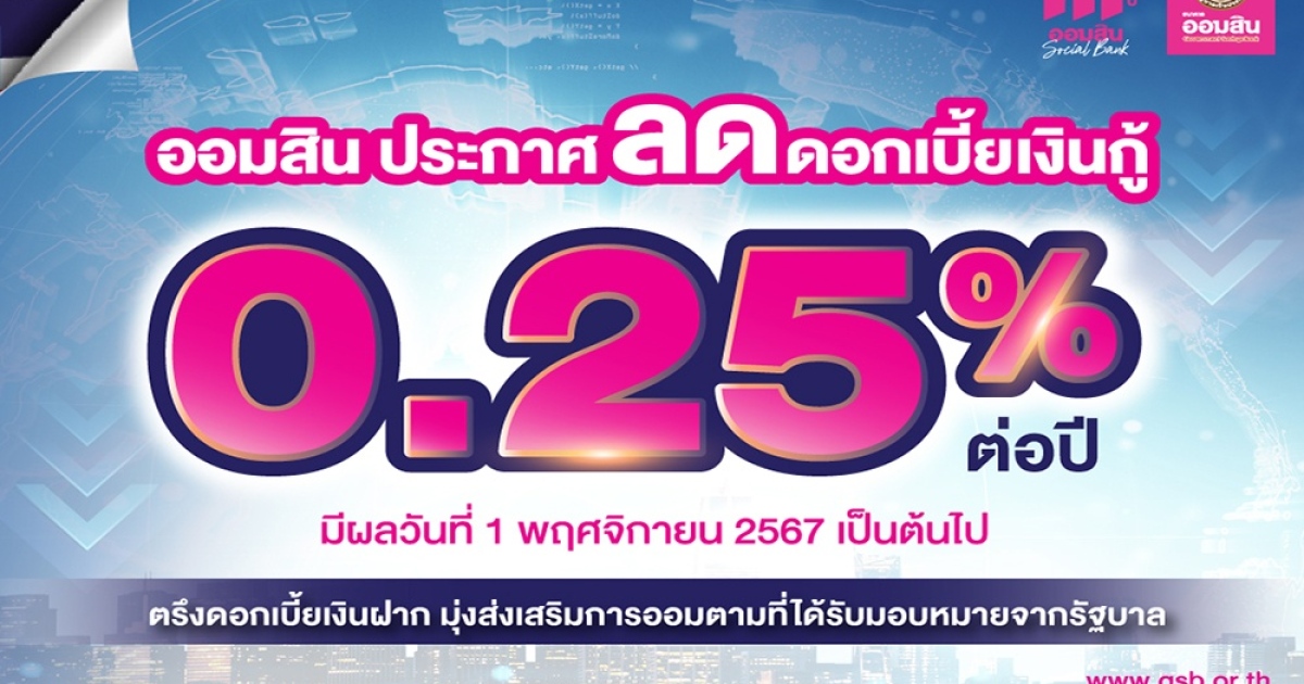 ออมสิน ประกาศลดดอกเบี้ยเงินกู้ 0.25% มีผล 1 พ.ย. 67 ตรึงดอกเบี้ยเงินฝาก ตามภารกิจส่งเสริมการออม