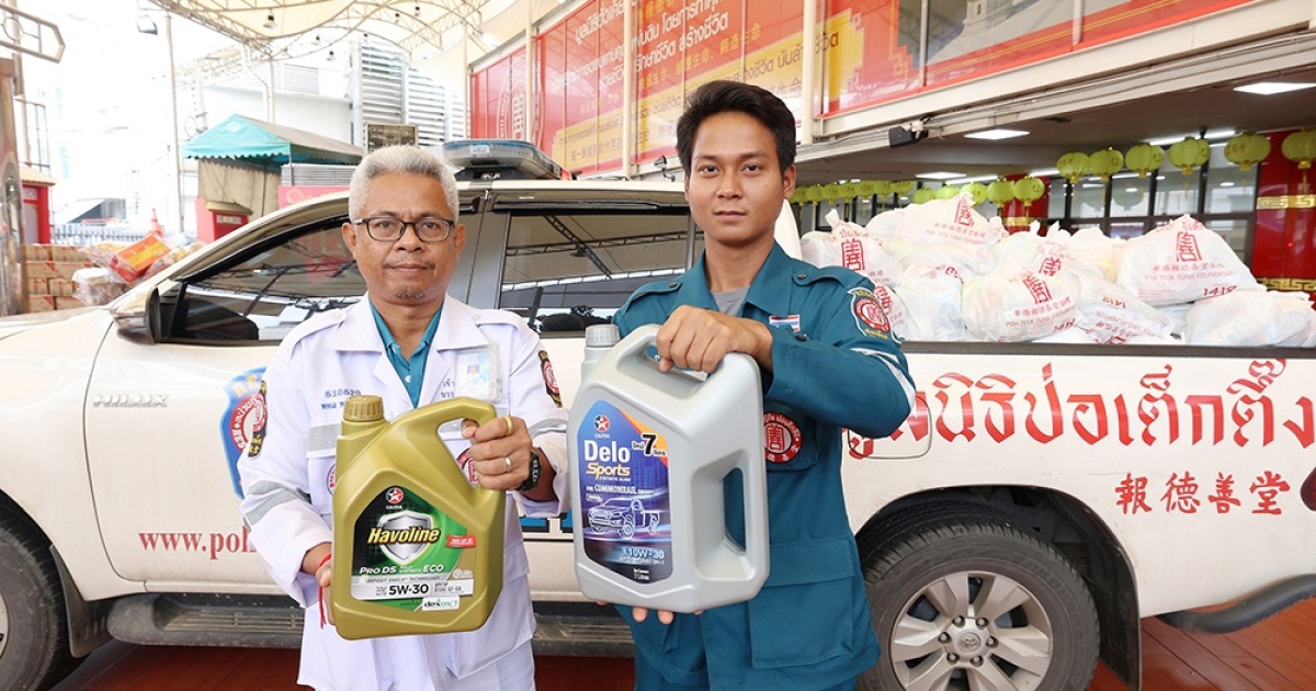 บริษัท เชฟรอน (ไทย) จำกัด ผู้ผลิตและจัดจำหน่ายผลิตภัณฑ์น้ำมันหล่อลื่นคาลเท็กซ์ ฮาโวลีน และ คาลเท็กซ์ เดโล่ นำโดย นายถกลฤทธิ์ อาริยวัฒน์ ผู้จัดการแผนกส่งเสริมการขายผลิตภัณฑ์น้ำมันหล่อลื่น และนางสาวสุพิชฌาย์ ดิลกไชยชาญวุฒิ เจ้าหน้าที่ฝ่ายการตลาดผลิตภัณฑ์น้ำมันหล่อลื่น ร่วมส่งมอบผลิตภัณฑ์น้ำมันเครื่องในกลุ่มต่าง ๆ ได้แก่ เดโล่ สปอร์ต ซินเธติก เบลนด์ SAE 10W-30 เดโล่ สปอร์ต ซินเธติก เบลนด์ SAE 15W-40 (สำหรับรถปิกอัพ) ฮาโวลีน โปรดีเอส ฟูลลี่ ซินเธติก อีโค่ SAE 5W-30 (สำหรับรถเก๋ง) และ ฮาโวลีน ซูเปอร์เมติก 4 ที เซมิ-ซินเธติก SAE 10W-40 (สำหรับรถจักรยานยนต์) ให้กับทีมบรรเทาสาธารณภัย อย่าง มูลนิธิป่อเต็กตึ๊ง และมูลนิธิร่วมกตัญญู เพื่อสนับสนุนให้หน่วยงานร่วมช่วยเหลือผู้ประสบอุทกภัย โดยมี นายวรพจน์ จรัสเศรษฐสิริ รักษาการผู้ช่วยผู้จัดการฝ่ายปฏิบัติ มูลนิธิป่อเต็กตึ๊ง และนางสาวสกาวรัตน์ สมสกุลรุ่งเรือง เลขาธิการ มูลนิธิร่วมกตัญญู เป็นตัวแทนรับมอบ