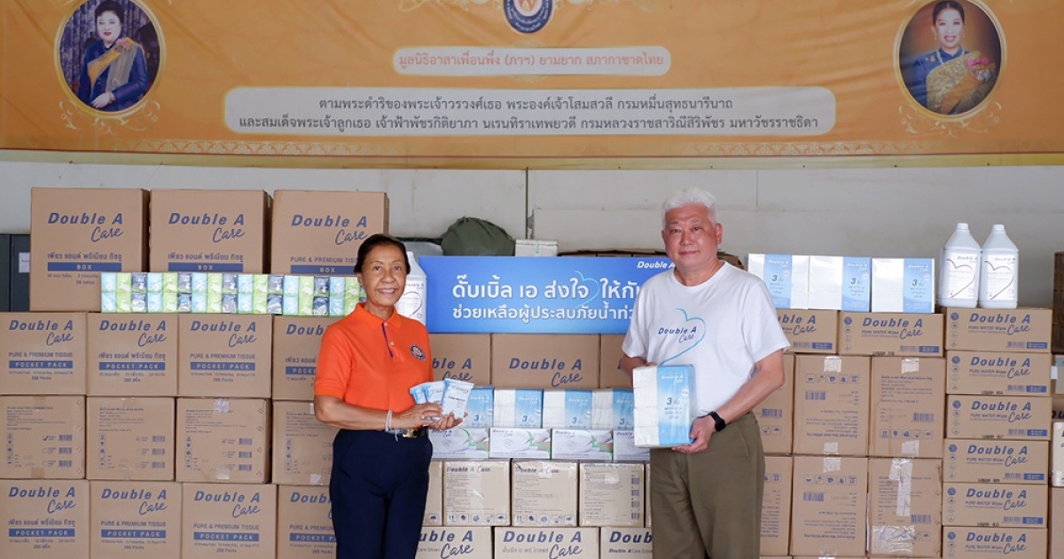 นายชาญวิทย์ จารุสมบัติ รองกรรมการผู้จัดการใหญ่ ดั๊บเบิ้ล เอ เป็นตัวแทนมอบผลิตภัณฑ์เพื่อสุขอนามัย Double A Care ให้กับมูลนิธิเพื่อนพึ่ง(ภาฯ)ยามยาก สภากาชาดไทย ภายใต้โครงการ "ดั๊บเบิ้ล เอ ส่งใจให้กัน" ซึ่งลูกค้าของดั๊บเบิ้ล เอ ได้มีส่วนร่วม โดยทุก ๆ การสั่งซื้อผลิตภัณฑ์ดั๊บเบิ้ล เอ ผ่านช่องทางออนไลน์ตลอดเดือนกันยายน เท่ากับได้ร่วมบริจาค Double A Care เพียว & พรีเมียม ทิชชู ในการช่วยเหลือผู้ประสบภัยน้ำท่วม และดั๊บเบิ้ล เอ ยังได้สมทบผลิตภัณฑ์เพื่อสุขอนามัย Double A Care เพิ่มเติม อาทิ ถุงมือยาง น้ำยาทำความสะอาดพื้นและฆ่าเชื้อโรค เพื่อช่วยเหลือฟื้นฟูผู้ประสบภัยน้ำท่วมที่ได้รับความเสียหายหลังน้ำลด และแบ่งเบาภาระค่าใช้จ่ายของครอบครัว โดยมี นางปาริชาต ธีระศิลป์ รองผู้จัดการมูลนิธิฯ เป็นผู้แทนรับมอบ