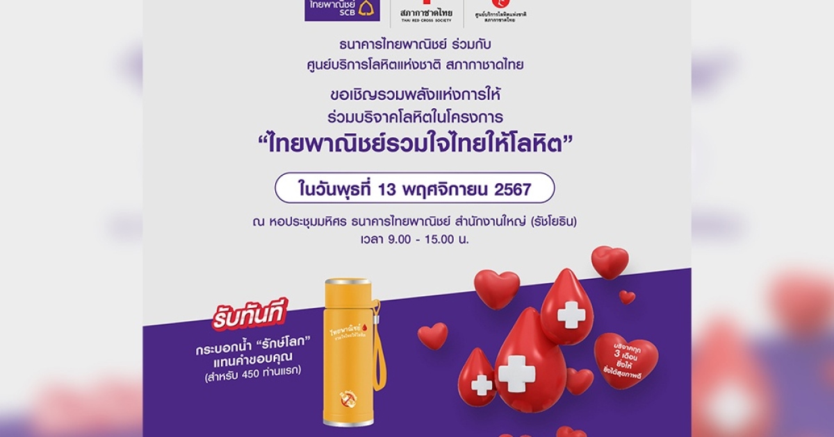 ธนาคารไทยพาณิชย์ร่วมกับศูนย์บริการโลหิตแห่งชาติ สภากาชาดไทย ขอเชิญรวมพลังแห่งการให้ร่วมบริจาคโลหิต ภายใต้โครงการ “ไทยพาณิชย์รวมใจไทยให้โลหิต” ในวันพุธที่ 13 พฤศจิกายน 2567 เวลา 9.00-15.00 น. ณ หอประชุมมหิศร ธนาคารไทยพาณิชย์ สำนักงานใหญ่ (รัชโยธิน) เพื่อเติมเต็มและส่งต่อโลหิตที่มีคุณภาพให้มีเพียงพอต่อการรักษาพยาบาลผู้ป่วยทั่วประเทศ ยังมีผู้ป่วยจำนวนมากที่กำลังรอรับโลหิตเพื่อต่อลมหายใจ การบริจาคโลหิต 1 ครั้ง สามารถนำไปช่วยชีวิตผู้ป่วยได้มากกว่า 3 ชีวิต สำหรับ 450 ท่านแรกที่ร่วมบริจาคโลหิต รับทันทีกระบอกน้ำ “รักษ์โลก” แทนคำขอบคุณ