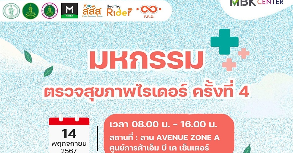 ศูนย์การค้าเอ็ม บี เค เซ็นเตอร์ สนับสนุนให้คนไทยมีสุขภาพและคุณภาพชีวิตที่ดี ร่วมกับ โรงพยาบาลกลาง สำนักการแพทย์ กรุงเทพมหานคร จัดกิจกรรม มหกรรมตรวจสุขภาพไรเดอร์ (Rider Day) ครั้งที่ 4 ในวันพฤหัสบดีที่ 14 พฤศจิกายน 2567 ตั้งแต่เวลา 08.00 น.- 16.00 น. ขานรับนโยบายกรุงเทพมหานคร ด้านการแพทย์และสาธารณสุข ในโครงการคาราวานตรวจสุขภาพฟรี 1 ล้านคน ปี 2 จัดตั้งจุดให้บริการตรวจคัดกรองสุขภาพเบื้องต้นในกลุ่มไรเดอร์ หรือ พนักงานส่งอาหาร ผู้ขับขี่มอเตอร์ไซต์รับจ้างและครอบครัว รวมถึงประชาชนทั่วไปที่มีอายุตั้งแต่ 15 ปีขึ้นไป โดยไม่มีค่าใช้จ่าย เพียงแสดงบัตรประจำตัวประชาชน (งดน้ำและอาหารก่อนตรวจ 8-10 ชั่วโมง)