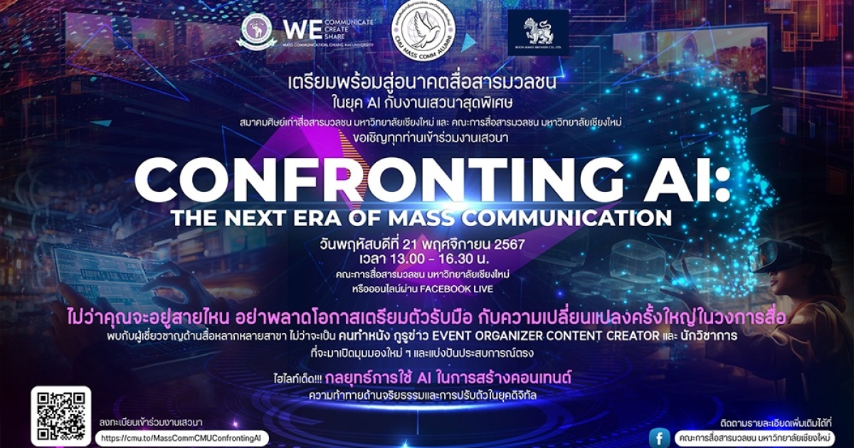 สมาคมศิษย์เก่าสื่อสารมวลชน มหาวิทยาลัยเชียงใหม่ และ คณะการสื่อสารมวลชน มหาวิทยาลัยเชียงใหม่ ขอเชิญทุกท่านเข้าร่วมงานเสวนา “CONFRONTING AI: THE NEXT ERA OF MASS COMMUNICATION”