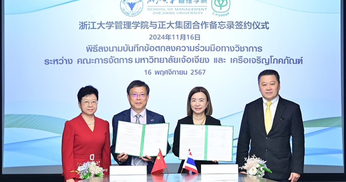 เมื่อวันที่ 16 พ.ย. 67 เครือเจริญโภคภัณฑ์ และมหาวิทยาลัยเจ้อเจียง สถาบันอุดมศึกษาชั้นนำของประเทศจีน ที่มีความเป็นเลิศด้านวิทยาศาสตร์และเทคโนโลยี ได้ผนึกกำลังเป็นพันธมิตรเพื่อขับเคลื่อนการพัฒนาทรัพยากรมนุษย์ นวัตกรรม และการวิจัยในหลากหลายสาขาเพื่ออนาคตที่ยั่งยืน ถือเป็นความร่วมมือระหว่างภาคธุรกิจและสถาบันการศึกษาในระดับนานาชาติ เพื่อประโยชน์ในระดับสากลและสร้างอนาคตที่ยั่งยืนให้กับสังคมทั้งไทยและจีน ในพิธีลงนามความร่วมมือ MOU นี้มีนาย จู หยวน (ZHU Yuan) ประธานสภาประจำคณะการจัดการ มหาวิทยาลัยเจ้อเจียง และนางสาวพิมลรัตน์ รีพัฒนาวิจิตรกุล ประธานผู้บริหารทรัพยากรบุคคล เครือเจริญโภคภัณฑ์ เป็นผู้แทนในการลงนามครั้งสำคัญนี้ ท่ามกลางสักขีพยานสำคัญของทั้ง 2 ฝ่าย ได้แก่ Ms. Wang Huan เลขานุการเอก ฝ่ายการศึกษา สถานเอกอัครราชทูตจีน ประจำประเทศไทย (ซีพี) นายสุภกิต เจียรวนนท์ ประธานกรรมการเครือซีพี นายประสิทธิ์ บุญดวงประเสริฐ ประธานคณะผู้บริหาร (Chief Executive Officer) บริษัท เจริญโภคภัณฑ์อาหาร จำกัด (มหาชน) นายธนิศร์ เจียรวนนท์ ประธานเจ้าหน้าที่บริหาร (Chief Executive Officer) ธุรกิจค้าส่งแม็คโครประเทศไทย และนายมนัสส์ มานะวุฒิเวช ประธานเจ้าหน้าที่บริหาร (Chief Executive Officer) บริษัท ทรู คอร์ปอเรชั่น จำกัด (มหาชน)