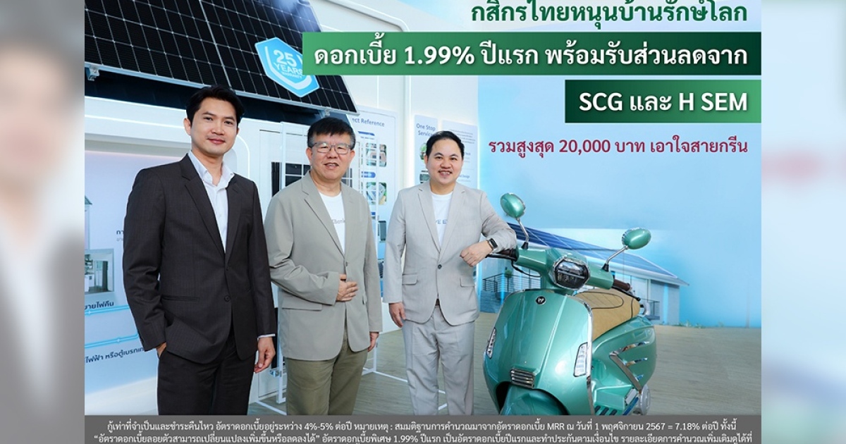 นายชัยยศ ตันพิสุทธิ์ (กลาง) ผู้ช่วยผู้จัดการใหญ่ ธนาคารกสิกรไทย ร่วมด้วยนายธัญญ์กวิน บุดดีมี (ซ้าย) กรรมการผู้จัดการ บริษัท เอสซีจี เอ็กซพีเรียนซ์ จำกัด และนายวันชัย ลี้นะวัฒนา (ขวา) ประธานเจ้าหน้าที่บริหาร บริษัท เอช เซม มอเตอร์ จำกัด จับมือจัดโปรโมชันหนุนลูกค้าที่ซื้อบ้านประหยัดพลังงาน ด้วยแคมเปญสินเชื่อบ้านสีเขียว ดอกเบี้ยพิเศษ 1.99% ปีแรก พร้อมส่วนลดในการซื้อสินค้าและบริการที่มีนวัตกรรมช่วยประหยัดพลังงานจาก SCG Home Experience และยานพาหนะไฟฟ้าพลังงานสะอาดจาก H SEM มูลค่ารวมสูงสุดกว่า 20,000 บาท เพื่อสนับสนุนให้ลูกค้าเข้าถึงไลฟ์สไตล์ Green Living ได้ง่ายขึ้น รวมทั้งเป็นการสร้าง Green Ecosystem ให้เกิดขึ้นอย่างต่อเนื่อง