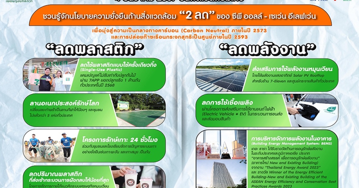 2. “ลดการใช้พลังงาน” กำหนดนโยบายในการใช้ทรัพยากรให้เกิดประสิทธิภาพสูงสุด พร้อมทั้งส่งเสริมให้เกิดการใช้พลังงานหมุนเวียน อาทิ โครงการลดการใช้เชื้อเพลิงผ่านการจัดตั้งโครงการส่งเสริมการใช้ยานยนต์ไฟฟ้า (Electric Vehicle • EV) ในกระบวนการขนส่งและส่งมอบสินค้า, โครงการส่งเสริมการผลิตไฟฟ้าจากพลังงานแสงอาทิตย์ ชนิดติดตั้งบนหลังคา (Solar PV Rooftop) สำหรับร้าน 7-Eleven และศูนย์กระจายสินค้าทั่วประเทศ, โครงการบริหารจัดการพลังงานในอาคาร (Building Energy Management System: BEMS), โครงการปรับปรุงระบบทำความเย็น และใช้สารทำความเย็นที่เป็นมิตรกับสิ่งแวดล้อม เป็นต้น