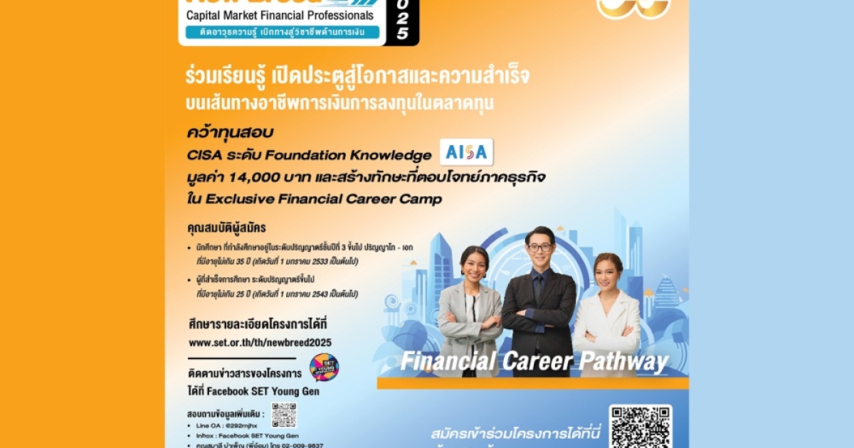 ตลาดหลักทรัพย์ฯ ชวนนิสิตนักศึกษาและวัยเริ่มต้นทำงาน (First Jobber) ร่วมค้นหาศักยภาพด้านการเงินการลงทุนของตนเองไปกับโครงการ “New Breed Capital Market Financial Professionals 2025” ติดอาวุธความรู้ เพิ่มทักษะในสายอาชีพการเงินและการลงทุน พร้อมโอกาสคว้าทุนสอบ CISA ระดับ Foundation Knowledge (AISA) มูลค่า 14,000 บาท จำนวน 250 ทุน และโอกาสสร้างทักษะที่ตอบโจทย์ภาคธุรกิจในกิจกรรม Exclusive Financial Career Camp สมัครได้ตั้งแต่วันนี้ - 28 กุมภาพันธ์ 2568