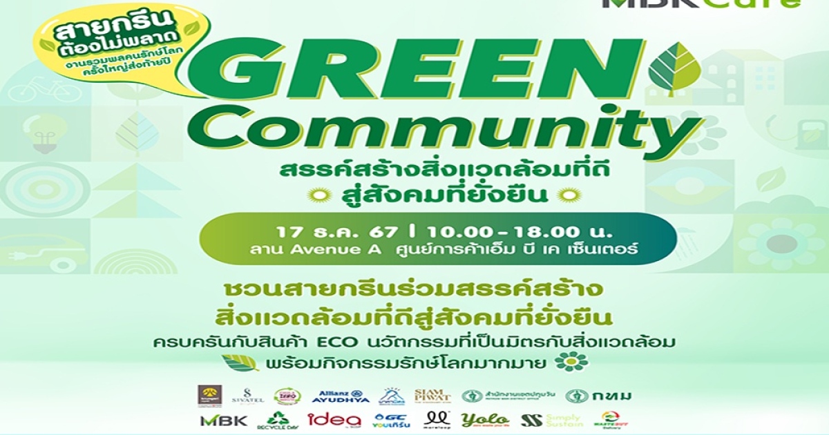 ในเดือนแห่งวันสิ่งแวดล้อมไทย องค์กรไทยหัวใจสีเขียว บริษัท เอ็ม บี เค จำกัด (มหาชน) หรือ เอ็ม บี เค (MBK) จัดงาน “Green Community” ผนึกกำลัง “พันธมิตรสายกรีน” ขับเคลื่อนความยั่งยืนทางธุรกิจ ร่วมสรรค์สร้างสิ่งแวดล้อมที่ดีสู่สังคมที่ยั่งยืน ในวันอังคารที่ 17 ธันวาคม 2567 เวลา 10.00 น. – 18.00 น. บริเวณลานกิจกรรมเอ็ม บี เค อเวนิว โซน A ศูนย์การค้าเอ็ม บี เค เซ็นเตอร์