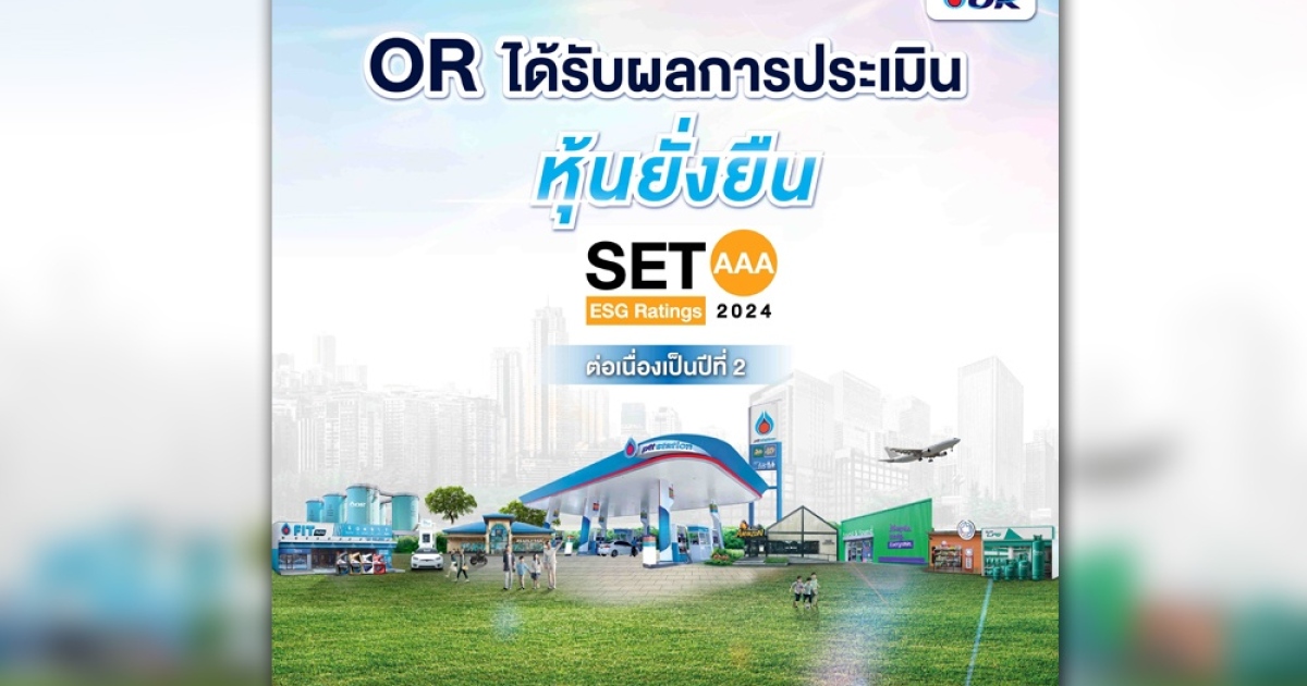 OR ได้รับการประเมินหุ้นยั่งยืน SET ESG Ratings ประจำปี 2567 ที่ระดับสูงสุด “AAA” ในกลุ่มอุตสาหกรรมทรัพยากร ต่อเนื่องเป็นปีที่ 2 ตอกย้ำความมุ่งมั่นในการดำเนินงานธุรกิจตามวิสัยทัศน์ “Empowering All toward Inclusive Growth: OR เติมเต็มโอกาส เพื่อทุกการเติบโต ร่วมกัน”