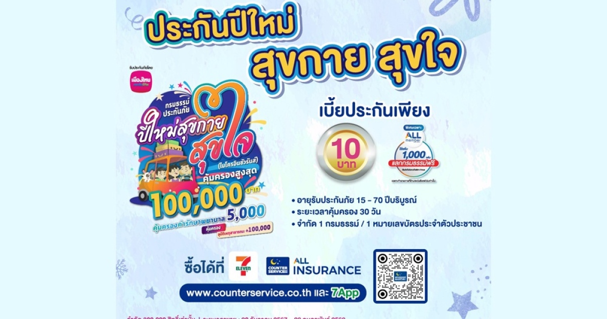 บริษัท เมืองไทยประกันชีวิต จำกัด (มหาชน) ผนึกกำลังกับ บริษัท เคาน์เตอร์เซอร์วิส จำกัด ส่งมอบความสุขและความอุ่นใจไปยังลูกค้าและประชาชนทั่วประเทศ ให้ทุกคนได้มีรอยยิ้มในช่วงเทศกาลส่งท้ายปีเก่าต้อนรับปีใหม่ ผ่าน “กรมธรรม์ประกันภัยปีใหม่สุขกายสุขใจ (ไมโครอินชัวรันส์)” ประกันภัยอุบัติเหตุกลุ่มที่ให้ความคุ้มครองครอบคลุมทั้งด้านชีวิตและค่ารักษาพยาบาลเนื่องจากอุบัติเหตุ