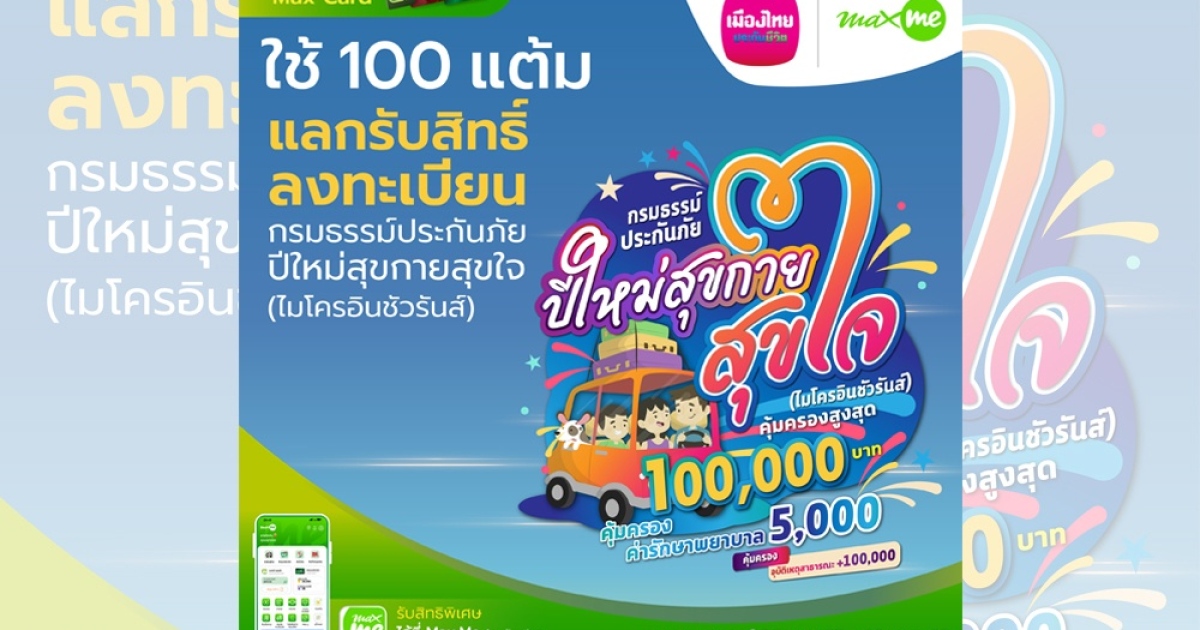 เมืองไทยประกันชีวิต และ แมกซ์ โซลูชัน บริษัทในเครือพีทีจี ผนึกกำลังส่งมอบความสุขและรอยยิ้มในช่วงเทศกาลต้อนรับปีใหม่ 2568 แก่สมาชิก Max Card ทั่วประเทศ ผ่าน “กรมธรรม์ประกันภัยปีใหม่สุขกายสุขใจ (ไมโครอินชัวรันส์)” อุ่นใจด้วยความคุ้มครองครอบคลุมทั้งด้านชีวิตและค่ารักษาพยาบาลเนื่องจากอุบัติเหตุ เพียงสมาชิก Max Card ใช้คะแนน 100 คะแนน แลกรับสิทธิ์ง่าย ๆ ผ่านช่องทางแอปพลิเคชัน Max Me