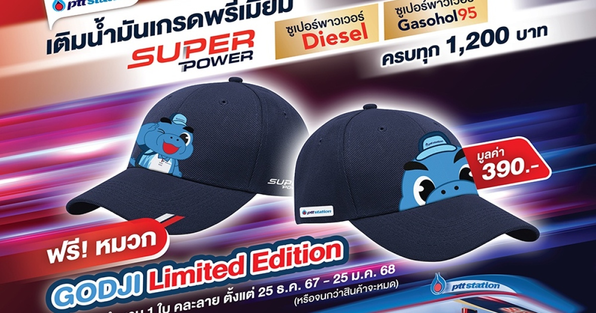 สำหรับสาวก "Super Power" ทั้งหลาย เตรียมตัวให้พร้อม เติมเต็มพลังที่เหนือกว่า เพียงเติมน้ำมัน Super Power ครบทุก 1,200 บาท รับหมวก GODJI Limited Edition คละลายฟรี 1 ใบ ระหว่างวันที่ 25 ธันวาคม 2567 – 25 มกราคม 2568 ที่สถานีบริการ พีทีที สเตชั่น ทั่วประเทศที่จำหน่ายน้ำมันเกรดพรีเมียม Super Power ตรวจสอบสถานีบริการ พีทีที สเตชั่น ที่จำหน่ายน้ำมัน Super Power ได้ที่ https://www.pttstation.com/th