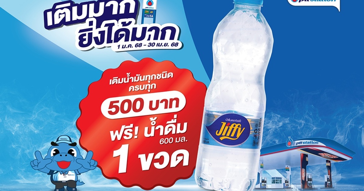 พีทีที สเตชั่น ต้อนรับปีใหม่ 2568 กับโปรสุดคุ้ม "เติมมาก ยิ่งได้มาก" ร่วมเติมเต็มความสดชื่นให้กับผู้ใช้บริการทุกคน เมื่อเติมน้ำมันชนิดใดก็ได้ครบทุก 500 บาท/ใบเสร็จ รับฟรี! น้ำดื่ม 600 มล. (จิฟฟี่หรือสิงห์) ตั้งแต่วันที่ 1 มกราคม – 30 เมษายน 2568 ณ พีทีที สเตชั่น ทุกสาขาทั่วประเทศที่ร่วมรายการ