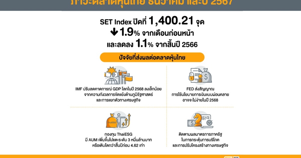 - ณ สิ้นเดือนธันวาคม 2567 SET Index ปิดที่ 1,400.21 จุด ทำให้ช่วงครึ่งหลังของปี 2567 SET Index ปรับเพิ่มขึ้น 7.6% ส่งผลให้ตั้งแต่ต้นปีถึงสิ้นเดือนธันวาคม 2567 SET Index ปรับลดลงเพียง 1.1%