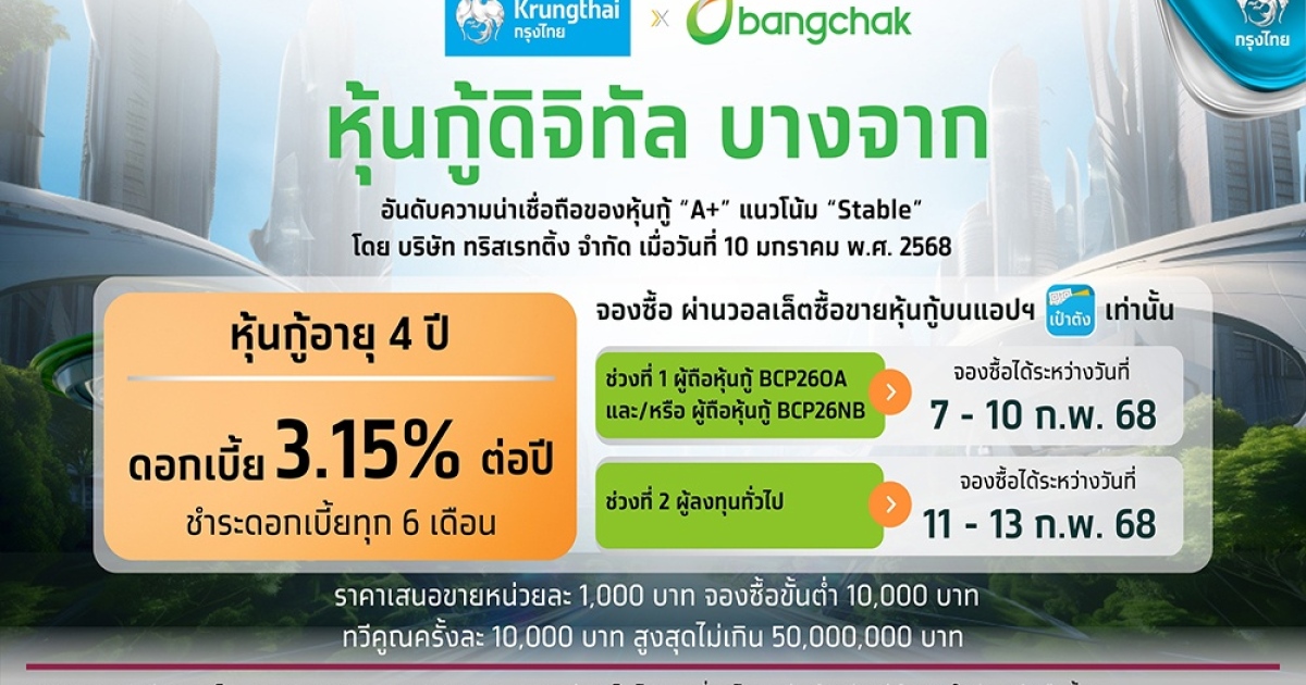 เตรียมจองซื้อ “หุ้นกู้ดิจิทัลบางจาก” อายุ 4 ปี ดอกเบี้ย 3.15% บนแอปฯ “เป๋าตัง” ครั้งแรกกับการให้สิทธิ์ผู้ถือหุ้นกู้ดิจิทัลบางจากจองซื้อก่อน ดีเดย์ 7-13 ก.พ. 68 นี้