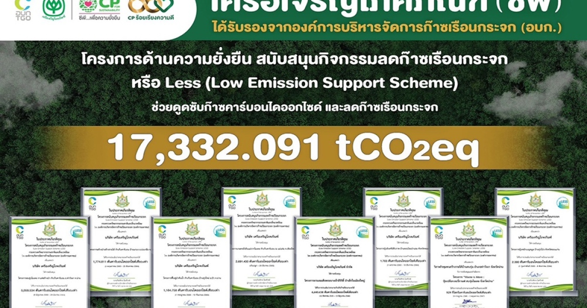 โดยล่าสุดในปี 2567 ได้รับการรับรองเพิ่มในโครงการ “Waste is More : ปุ๋ยเปลือกเชอรี่กาแฟ สบขุ่นโมเดล จ.น่าน” โดยนำเปลือกกาแฟเชอรี่ที่เหลือทิ้งจากการแปรรูป มาทำเป็นปุ๋ยอินทรีย์หมุนเวียนกลับไปใช้ซ้ำ สามารถลดการปล่อยก๊าซเรือนกระจกได้ 0.92 tCO2eq ทั้งนี้ 8 โครงการดังกล่าวฯ สามารถกักเก็บคาร์บอนและลดก๊าซเรือนกระจก สะสมรวม 17,332.091 tCO2eq โดยเป็นโครงการที่เครือซีพีสนับสนุนด้านอนุรักษ์ ฟื้นฟูธรรมชาติและสิ่งแวดล้อม เพื่อผลักดันเป้าหมายมุ่งสู่องค์กรปลดปล่อยก๊าซเรือนกระจกเป็นศูนย์ พร้อมทั้งลดความเหลื่อมล้ำที่ถือเป็นอีกความท้าทายของโลก โดยช่วยยกระดับคุณภาพชีวิตชุมชน สร้างโอกาสทางด้านอาชีพและรายได้อย่างยั่งยืน