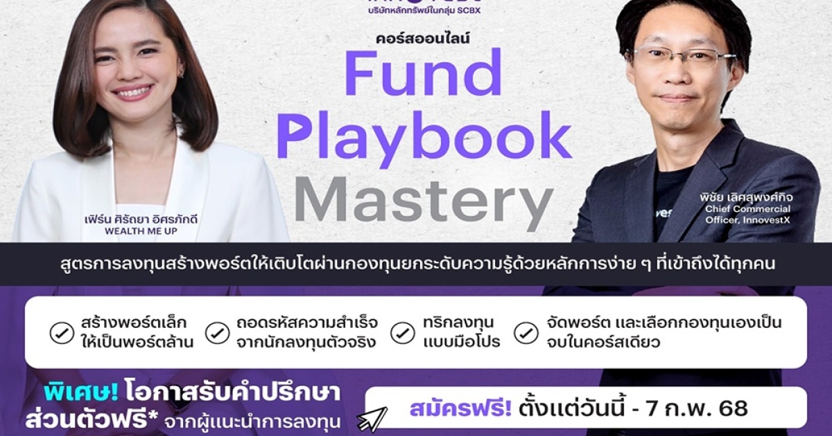 บริษัทหลักทรัพย์ อินโนเวสท์ เอกซ์ จำกัด เรือธงด้านการลงทุนภายใต้กลุ่มเอสซีบีเอกซ์ (SCBX Group) เดินหน้าผลักดันการสร้างความรู้ด้านการลงทุนให้กับคนไทยอย่างต่อเนื่อง ล่าสุด เปิดหลักสูตร"Fund Playbook Mastery" คอร์สเรียนออนไลน์ที่ออกแบบมาเพื่อให้ผู้ที่สนใจลงทุน ร่วมเจาะลึก Playbook ไขสูตรการลงทุน โดยคอร์สเรียนออนไลน์นี้จะเน้นการยกระดับความรู้ด้วยหลักการง่ายๆ เข้าถึงได้ทุกคน ถอดรหัสความสำเร็จจากนักลงทุนตัวจริง พร้อมแชร์เทคนิคการลงทุนแบบมืออาชีพที่สามารถนำไปใช้ได้จริง เพื่อสร้างพอร์ตการลงทุนผ่านกองทุนให้เติบโตในระยะยาวและเห็นผลลัพธ์ที่จับต้องได้ จากวิทยากรผู้เชี่ยวชาญในแวดวงการลงทุนมาร่วมให้ความรู้ความเข้าใจในทุกมิติ ตลอดจนกลยุทธ์การลงทุนที่เหมาะสมกับทุกจังหวะตลาดและสไตล์การลงทุน นำโดย คุณเฟิร์น ศิรัถยา อิศรภักดี เจ้าของเพจ WEALTH ME UP นักลงทุนมืออาชีพ ผู้มีประสบการณ์ด้านการลงทุนกว่า 20 ปี ที่เข้าใจ Insight นักลงทุนมือใหม่ และคุณพิชัย เลิศสุพงศ์กิจ Chief Commercial Officer, InnovestX