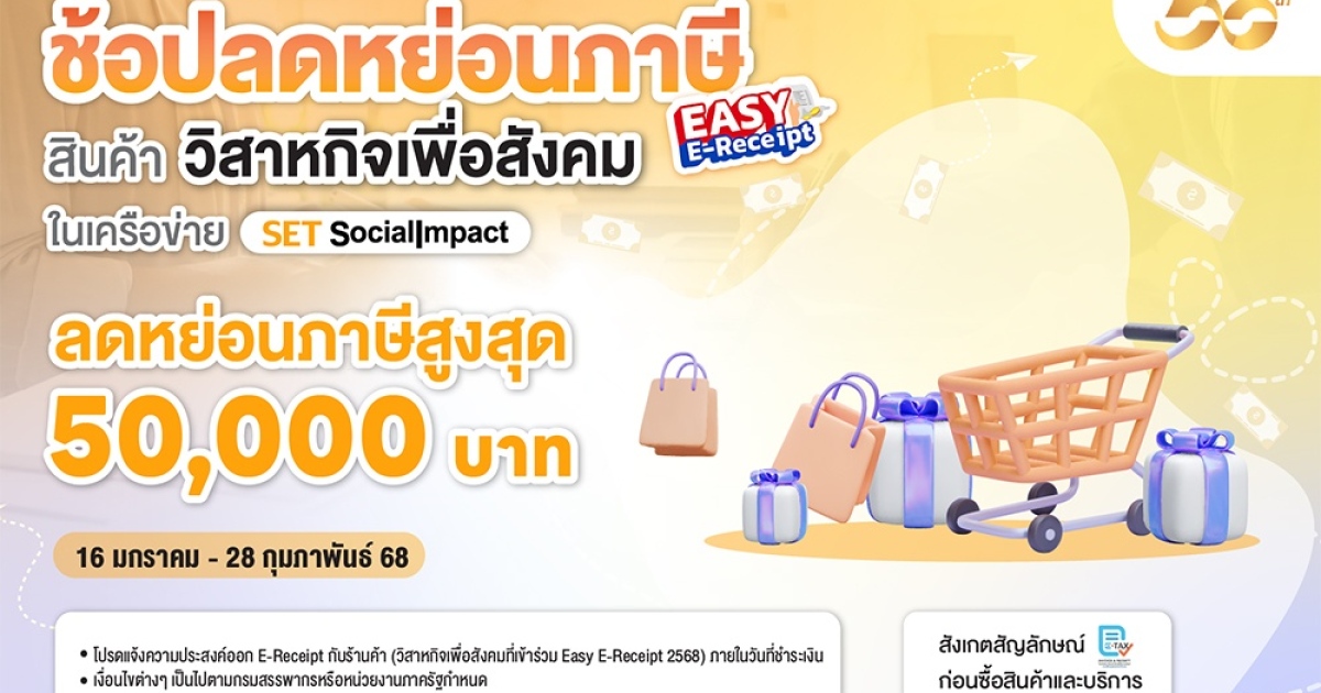 ตลาดหลักทรัพย์แห่งประเทศไทย เชิญชวนคนไทยใช้สิทธิ Easy E-Receipt 2.0 โดยร่วมสนับสนุนการซื้อสินค้าและบริการจากวิสาหกิจเพื่อสังคม (Social Enterprise: SE) ในเครือข่าย SET Social Impact เพื่อรับสิทธิลดหย่อนภาษีสูงสุด 50,000 บาท ตั้งแต่วันนี้–28 ก.พ. 2568 ได้ทั้งลดหย่อนภาษีและร่วมสนับสนุนการดูแลสังคมและสิ่งแวดล้อมไปด้วยกัน
