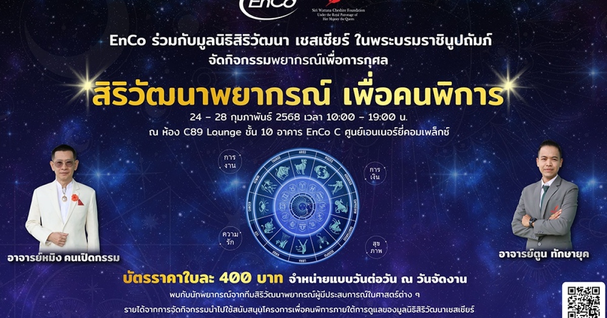 EnCo ชวนร่วมกิจกรรม “สิริวัฒนาพยากรณ์ เพื่อคนพิการ” ร่วมดูดวงพร้อมได้บุญ 24 – 28 กุมภาพันธ์ 2568 ณ ศูนย์เอนเนอร์ยี่คอมเพล็กซ์