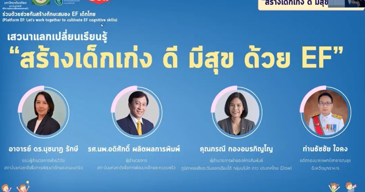 เมื่อวันที่ 26 กุมภาพันธ์ 2568 กลุ่มบริษัท ดาว ประเทศไทย (Dow) ร่วมกับ สถาบันแห่งชาติเพื่อพัฒนาเด็กและครอบครัว มหาวิทยาลัยมหิดล จัดเสวนา “สร้างเด็ก เก่ง ดี มีสุข ด้วย EF” พร้อมสรุปโครงการให้ความรู้การพัฒนาทักษะสมองเพื่อความสำเร็จ หรือ EF (Executive Function) ในเด็กเล็กแบบออนไลน์ที่ได้ทำร่วมกันตลอดปี 2567 ที่ผ่านมา โดยมีคุณครูและผู้ปกครองเข้าร่วมอบรม กว่า 17,407 คน พร้อมเผยผลวิจัยการเลี้ยงดูเด็กด้วยแนวทาง EF ส่งผลต่อพัฒนาการเด็กอย่างมีนัยสำคัญทางสถิติ รวมถึงระดับ IQ ของเด็กเพิ่มขึ้นกว่า 17% ใน 5 ปี นอกจากนี้ เสียงจากพ่อแม่ยังสะท้อนว่า การเล่นแบบ EF ทำให้ลูกรู้จักตั้งเป้าหมาย อดทนรอคอย และมีพัฒนาการที่ดีขึ้นอย่างเห็นได้ชัด