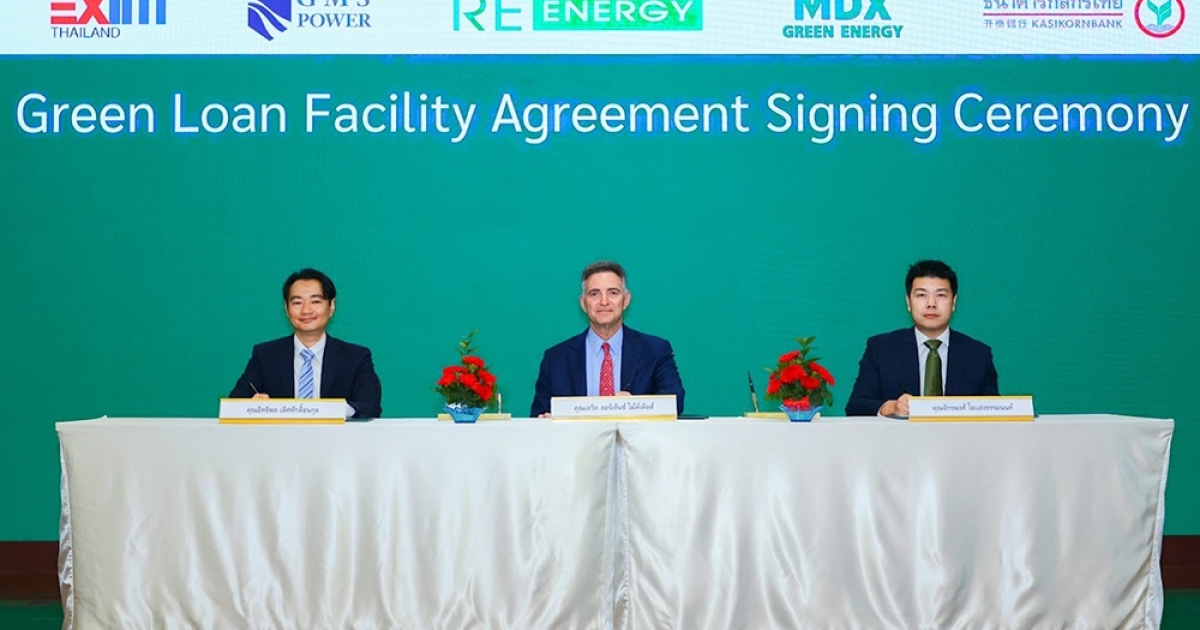 นายจักรพงศ์ โอแสงธรรมนนท์ ผู้ช่วยผู้จัดการใหญ่ (ขวา) ธนาคารกสิกรไทย นายอิทธิพล เลิศศักดิ์ธนกุล (ซ้าย) รองกรรมการผู้จัดการ ธนาคารเพื่อการส่งออกและนำเข้าแห่งประเทศไทย หรือ EXIM BANK พร้อมด้วย นายเดวิด ลอร์เร้นซ์ ไม้ค์เคิลส์ (กลาง) ประธานคณะกรรมการ และกรรมการผู้อำนวยการ บมจ. จี เอ็ม เอส เพาเวอร์ และ บจก. รี เอนเนอร์ยี ร่วมลงนามสนับสนุนทางการเงินสินเชื่อสีเขียว (Green Loan) วงเงิน 410 ล้านบาทแก่ บจก. รี เอนเนอร์ยี ผู้ผลิตและจำหน่ายไฟฟ้าจากพลังงานทดแทน ซึ่งเป็นบริษัทในกลุ่ม บมจ. จี เอ็ม เอส เพาเวอร์ ผู้ผลิตไฟฟ้ารายใหญ่ในประเทศไทยและภูมิภาคอาเซียน โดยธนาคารกสิกรไทย และ EXIM BANK สนับสนุนวงเงินแห่งละ 50% ณ ธนาคารกสิกรไทย สำนักงานใหญ่ เมื่อเร็ว ๆ นี้
