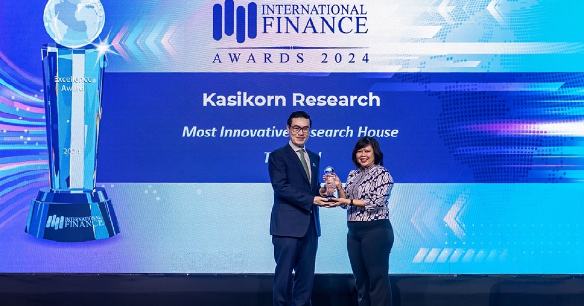 นายบุรินทร์ อดุลวัฒนะ กรรมการผู้จัดการ และ Chief Economist บริษัท ศูนย์วิจัยกสิกรไทย จำกัด เป็นผู้แทนรับรางวัล Most Innovative Research House (รางวัลสถาบันวิจัยที่มีนวัตกรรมยอดเยี่ยม) จากงาน International Finance Awards 2024 สะท้อนถึงความมุ่งมั่นในการพัฒนา นวัตกรรมงานวิจัยและการวิเคราะห์เชิงลึก เพื่อสนับสนุนการตัดสินใจทางธุรกิจและการลงทุนของธนาคาร ภาคธุรกิจ และลูกค้าทุกภาคส่วน จัดโดย International Finance นิตยสารด้านธุรกิจและการเงินชั้นนำระดับโลกจากประเทศอังกฤษ ณ โรงแรมวอลดอร์ฟ แอสโทเรีย กรุงเทพฯ เมื่อเร็ว ๆ นี้