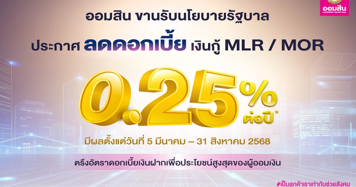 ออมสิน ประกาศลดดอกเบี้ยเงินกู้ MLR / MOR 0.25% ขานรับนโยบายรัฐช่วยภาคธุรกิจ พร้อมตรึงดอกเบี้ยเงินฝากเพื่อประโยชน์สูงสุดของผู้ออมเงิน