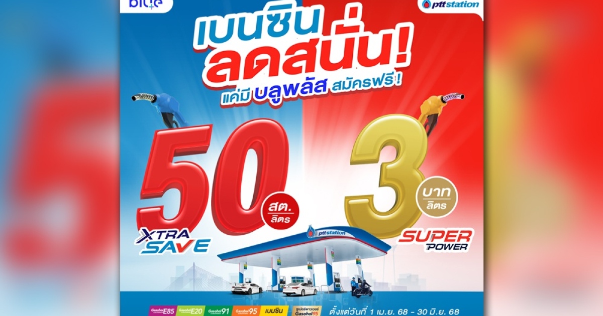 เบนซินลดสนั่น แค่เป็นสมาชิกบลูพลัส เติมน้ำมันกลุ่มเบนซินและแก๊สโซฮอล์ทุกชนิด รับส่วนลดทันที ตั้งแต่วันที่ 1 เมษายน 2568 – 30 มิถุนายน 2568