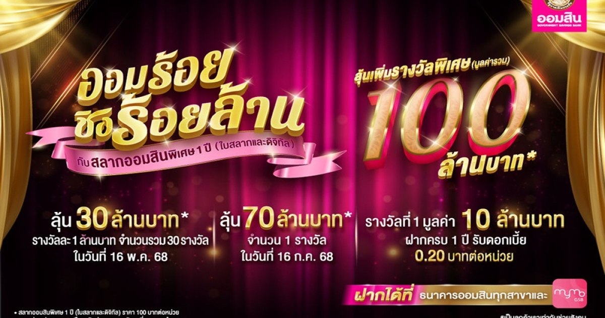 ฉลองใหญ่วันสถาปนาธนาคาร ! สลากออมสินพิเศษ 1 ปี “ออมร้อย ชิงร้อยล้าน” เริ่มฝากแค่ 100 มีสิทธิ์ลุ้น 100 ล้าน เปิดฝากสลากแล้ววันนี้