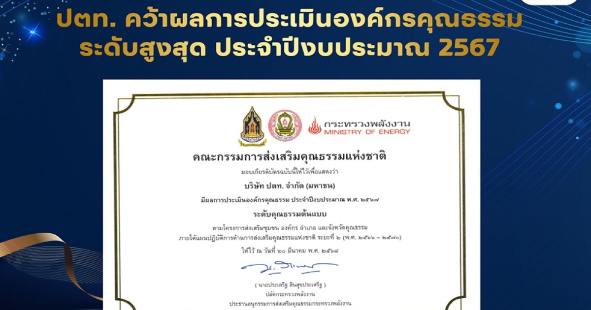 ปตท. คว้าผลการประเมินองค์กรคุณธรรม ระดับสูงสุด ประจำปีงบประมาณ 2567