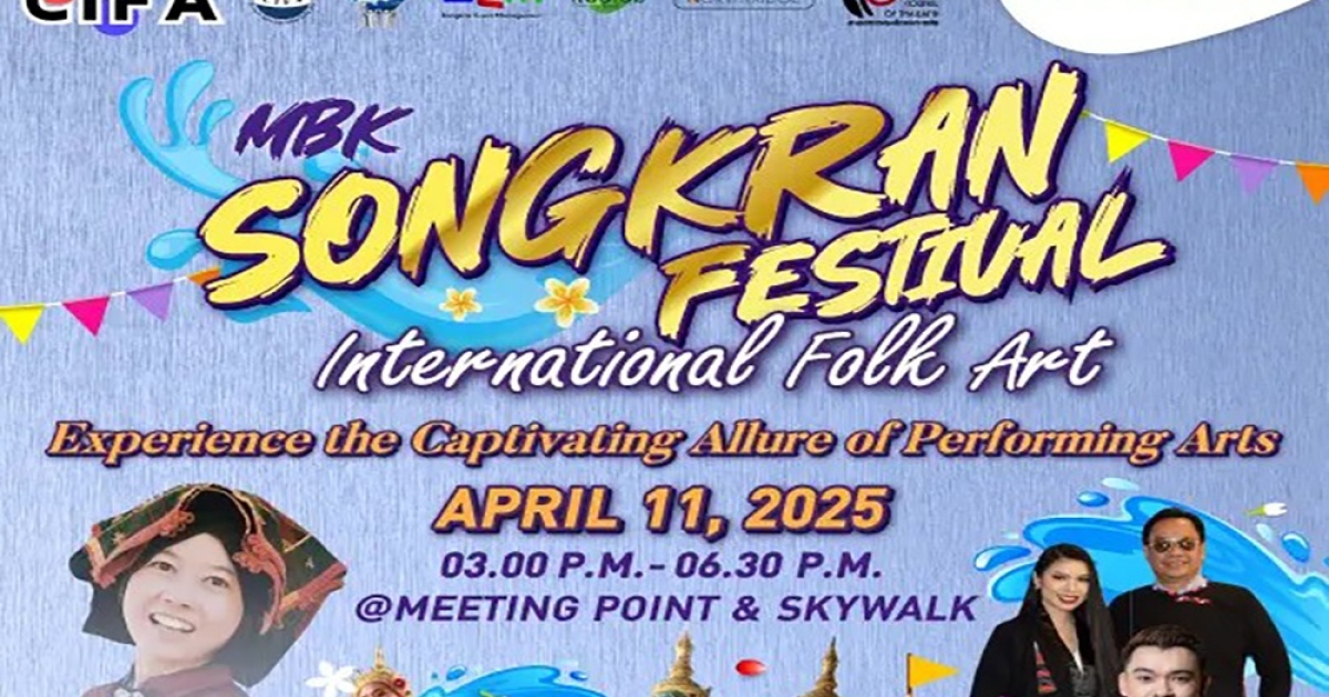 ศูนย์การค้าเอ็ม บี เค เซ็นเตอร์ ร่วมส่งเสริมการท่องเที่ยวเชิงวัฒนธรรม ชวนดื่มด่ำเสน่ห์ศิลปวัฒนธรรมพื้นบ้านนานาชาติจาก 6 ประเทศทั่วโลก นักแสดงกว่า 120 ชีวิต โดยชมรมสีสันวัฒนธรรมพื้นบ้านนานาชาติ Colors International Folk Art (CIFA) ในงาน MBK Songkran Festival International Folk Art ในวันศุกร์ที่ 11 เมษายน 2568 ตั้งแต่เวลา 15.00 น. – 18.30 น. บริเวณลานกิจกรรม Meeting Point ชั้น G โซน A และ ลาน Sky Walk