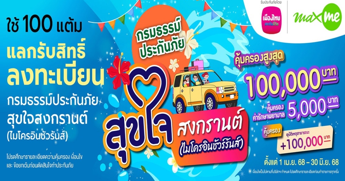 เมืองไทยประกันชีวิต ผนึกกำลัง แมกซ์ โซลูชัน บริษัทในเครือพีทีจี ร่วมเติมเต็มความสุขและความอุ่นใจในเทศกาลสงกรานต์ ปี 2568 แก่สมาชิก Max Card ทั่วประเทศ ผ่าน “กรมธรรม์ประกันภัยสุขใจสงกรานต์ (ไมโครอินชัวรันส์)” ที่ให้ความคุ้มครองครอบคลุมทั้งด้านชีวิตและค่ารักษาพยาบาลเนื่องจากอุบัติเหตุ เพียงสมาชิก Max Card เพียงใช้คะแนน 100 คะแนน แลกรับสิทธิ์ผ่านช่องทาง แอปพลิเคชัน Max Me