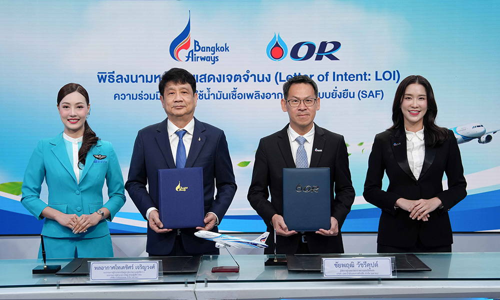 นายชัยพฤฒิ วัชรีคุปต์ ผู้จัดการฝ่ายตลาดอากาศยานและเรือขนส่ง บริษัท ปตท.น้ำมันและการค้าปลีก จำกัด (มหาชน) (OR) และนายเดชิศร์ เจริญวงศ์ รองกรรมการผู้อำนวยการใหญ่อาวุโส สายงานปฏิบัติการ / รองกรรมการผู้อำนวยการใหญ่ ฝ่ายปฏิบัติการบิน บริษัท การบินกรุงเทพ จำกัด (มหาชน) หรือ สายการบินบางกอกแอร์เวยส์ ร่วมลงนามหนังสือแสดงเจตจำนง (LOI) เรื่อง การซื้อน้ำมันเชื้อเพลิงอากาศยานแบบยั่งยืน (Sustainable Aviation Fuel: SAF) โดยผู้ผลิตภายในประเทศเป็นครั้งแรกของประเทศไทย สำหรับใช้ปฏิบัติการบินในเที่ยวบินของสายการบินบางกอกแอร์เวย์ส ณ สำนักงานใหญ่สายการบินบางกอกแอร์เวย์ส ถนนวิภาวดีรังสิต ตอบโจทย์เป้าหมายการพัฒนาอย่างยั่งยืนของทั้งสองบริษัท พร้อมผลักดันอุตสาหกรรมการบินของประเทศไทยก้าวสู่อนาคตการบินที่เป็นมิตรต่อสิ่งแวดล้อม