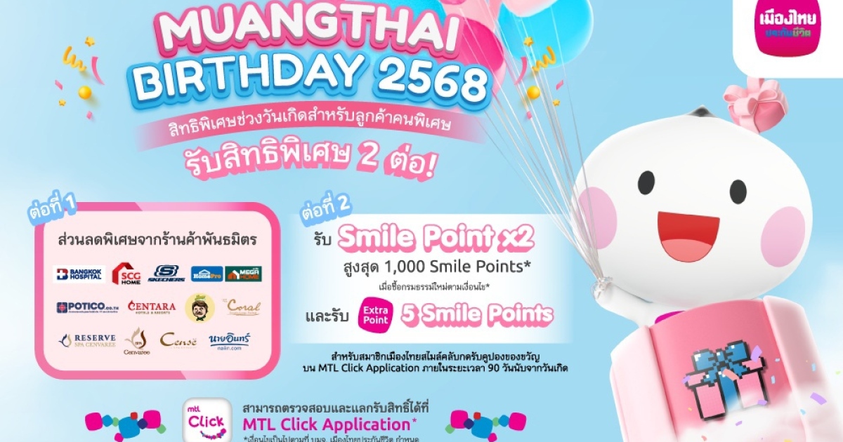 เมืองไทยประกันชีวิต ส่งมอบสิทธิพิเศษฉลองวันเกิด สมาชิกเมืองไทยสไมล์คลับ รับคะแนนสะสมคูณสอง พร้อมส่วนลดพิเศษจากพันธมิตรชั้นนำ