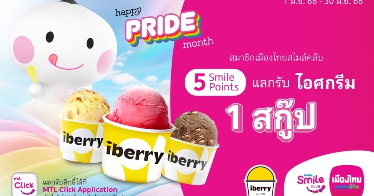 บริษัท เมืองไทยประกันชีวิต จำกัด (มหาชน) โดย “เมืองไทยสไมล์คลับ” เดินหน้าส่งมอบความสุขและรอยยิ้มให้สมาชิกเมืองไทยสไมล์คลับ ร่วมเฉลิมฉลองเทศกาล Pride Month 2025 สนับสนุนความเท่าเทียมและความหลากหลาย ล่าสุดจับมือ iberry เสิร์ฟความสุขให้สมาชิกเมืองไทยสไมล์คลับ รับความอร่อยจากไอศกรีมโฮมเมดฉ่ำชื่นใจตลอดเดือนมิถุนายน 2568 นี้