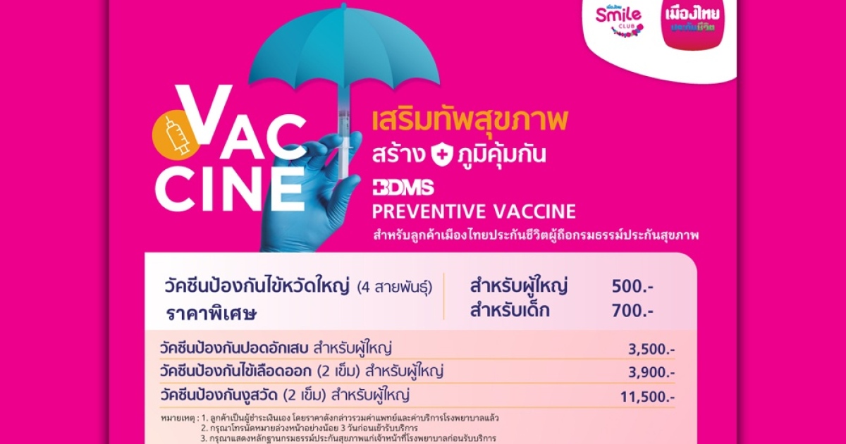 นอกจากนี้ เมืองไทยประกันชีวิตยังได้ร่วมแคมเปญ “BDMS PREVENTIVE VACCINE” มอบสิทธิพิเศษสำหรับผู้ถือกรมธรรม์ประกันสุขภาพ รับวัคซีนในราคาสุดพิเศษ (รวมค่าแพทย์) ครอบคลุม 4 กลุ่มโรคหลัก ได้แก่ วัคซีนป้องกันโรคไข้หวัดใหญ่ 4 สายพันธุ์ สำหรับผู้ใหญ่ราคา 500 บาท และเด็ก ราคา 700 บาท วัคซีนป้องกันโรคปอดอักเสบ สำหรับผู้ใหญ่ ราคา 3,500 บาท วัคซีนป้องกันโรคไข้เลือดออกสำหรับผู้ใหญ่ (2 เข็ม) รวมราคา 3,900 บาท และวัคซีนป้องกันโรคงูสวัดสำหรับผู้ใหญ่ (2 เข็ม) รวมราคา 11,500 บาท โดยผู้ถือกรมธรรม์ประกันสุขภาพของเมืองไทยประกันชีวิต สามารถแสดงหลักฐานเพื่อเข้ารับบริการได้ ณ โรงพยาบาลในเครือ BDMS ทั่วประเทศ ตั้งแต่วันที่ 16 พฤษภาคม 2568 – 30 มิถุนายน 2568 โดยผู้ที่สนใจสามารถสอบถามรายละเอียดเพิ่มเติม ได้ที่โรงพยาบาลในเครือ BDMS ทั่วประเทศ