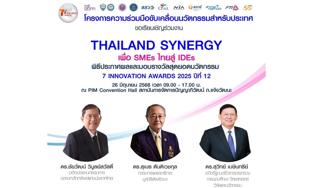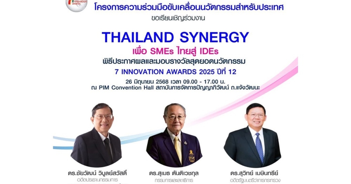 บริษัท ซีพี ออลล์ จำกัด (มหาชน) ผู้บริหารเซเว่น อีเลฟเว่นและเซเว่น เดลิเวอรี่ ผนึก 10 องค์กรพันธมิตรภาครัฐ-เอกชนระดับประเทศ จัดงานรวบรวมผลงานนวัตกรรมสุดยิ่งใหญ่แห่งปี “Thailand Synergy เพื่อ SMEs ไทยสู่ IDEs ประจำปี 2025” ต่อเนื่องเป็นปีที่ 12 พร้อมมอบรางวัลสุดยอดนวัตกรรม “7 Innovation Awards 2025” แก่ SME และบริษัทสตาร์ทอัพที่มีสินค้านวัตกรรมยอดเยี่ยม จนสามารถยกระดับสู่ธุรกิจนวัตกรรมได้อย่างน่าชื่นชม ทั้งด้านเศรษฐกิจ สังคม และเทคโนโลยี โดยได้รับเกียรติจาก ดร.ชัยวัฒน์ วิบูลย์สวัสดิ์ อดีตประธานกรรมการตลาดหลักทรัพย์แห่งประเทศไทย ดร.สุเมธ ตันติเวชกุล กรรมการและเลขาธิการมูลนิธิชัยพัฒนา ดร.สุวิทย์ เมษินทรีย์ อดีตรัฐมนตรีว่าการกระทรวงการอุดมศึกษา วิทยาศาสตร์ วิจัยและนวัตกรรม เป็นผู้มอบรางวัล ในวันพฤหัสบดีที่ 26 มิถุนายน 2568 เวลา 09.00-17.00 น. ณ PIM Convention Hall สถาบันการจัดการปัญญาภิวัฒน์ ถนนแจ้งวัฒนะ