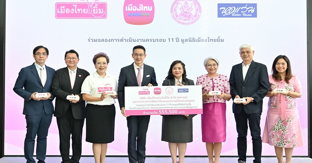 เมืองไทยประกันชีวิต ร่วมกับมูลนิธิเมืองไทยยิ้ม เดินหน้าสานต่อพันธกิจเพื่อสังคม มอบแว่นสายตาจำนวน 1,111 อัน ให้แก่กรมกิจการผู้สูงอายุ กระทรวงการพัฒนาสังคมและความมั่นคงของมนุษย์ เพื่อส่งเสริมคุณภาพชีวิตที่ดีแก่ผู้สูงอายุในสังคมไทย โดยมุ่งหวังให้การเข้าถึงการดูแลสุขภาพดวงตาอย่างเหมาะสม เป็นส่วนหนึ่งในการยกระดับชีวิตประจำวันและสร้างโอกาสในการมีชีวิตที่มีคุณภาพมากยิ่งขึ้น