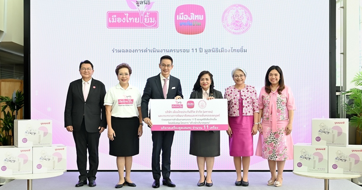 เมืองไทยประกันชีวิตและมูลนิธิเมืองไทยยิ้ม ร่วมมอบเครื่องดูดเสมหะ จำนวน 11 เครื่อง แก่กรมกิจการสตรีและสถาบันครอบครัว กระทรวงการพัฒนาสังคมและความมั่นคงของมนุษย์ เพื่อใช้ในการฝึกอบรมหลักสูตรผู้บริบาลคุ้มครองสิทธิผู้สูงอายุ ซึ่งเป็นหลักสูตรที่มุ่งสร้างอาชีพและพัฒนาทักษะให้แก่ประชาชน โดยเฉพาะกลุ่มสตรีและครอบครัวกลุ่มเปราะบาง เพื่อให้สามารถประกอบอาชีพเป็นผู้ดูแลผู้สูงอายุ (Care Giver) ได้อย่างมีคุณภาพ