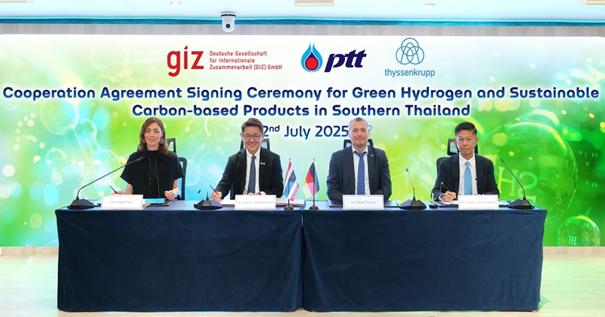 เมื่อเร็วๆ นี้ - บริษัท ปตท. จำกัด (มหาชน) (ปตท.) ร่วมกับ บริษัท ธิสเซ่นครุปป์ อูเด้ห์ (ประเทศไทย) จำกัด และองค์กรความร่วมมือระหว่างประเทศของเยอรมัน (GIZ) ลงนามสัญญาความร่วมมือโครงการศึกษาโอกาสความเป็นไปได้ในการพัฒนาไฮโดรเจนสีเขียวและผลิตภัณฑ์คาร์บอนที่ยั่งยืน ในพื้นที่ภาคใต้ของประเทศไทย ภายใต้กรอบของโครงการ “H2Uppp” ซึ่งได้รับการสนับสนุนทางการเงิน จากกระทรวงเศรษฐกิจและพลังงานแห่งสหพันธรัฐเยอรมนี โดยได้รับเกียรติจาก Mr. Dieter Wurche ผู้แทนจากสถานเอกอัครราชทูตเยอรมนีประจำประเทศไทย เข้าร่วมในพิธีลงนาม โดยมี ดร.บุรณิน รัตนสมบัติ ประธานเจ้าหน้าที่ปฏิบัติการกลุ่มธุรกิจใหม่และความยั่งยืน ปตท. พร้อมด้วย นายยศศิริ พร้อมเชื้อแก้ว ประธานเจ้าหน้าที่บริหาร บริษัท ธิสเซ่นครุปป์ อูเด้ห์ (ประเทศไทย) จำกัด และ Ms. Regine Dietz ผู้อำนวยการกลุ่มโครงการไฮโดรเจน GIZ ร่วมลงนาม เพื่อศึกษาความเป็นไปได้ของการผลิตไฮโดรเจนสีเขียว รวมถึงผลิตภัณฑ์คาร์บอนที่ยั่งยืน อาทิ อี-เมทานอล และ อี-มีเทน โดยใช้พลังงานหมุนเวียนในพื้นที่ภาคใต้ของประเทศไทย โดยครอบคลุมการศึกษาเทคโนโลยีที่เหมาะสม การประเมินทรัพยากรในพื้นที่ และการวิเคราะห์ศักยภาพของตลาด ตลอดจนการจัดทำแผนแม่บท เพื่อพัฒนาโครงการในเชิงพาณิชย์ในอนาคต สอดรับกับพันธกิจของ ปตท. ในการขับเคลื่อนเศรษฐกิจและสังคมไทยให้เติบโตอย่างมั่นคงและยั่งยืน