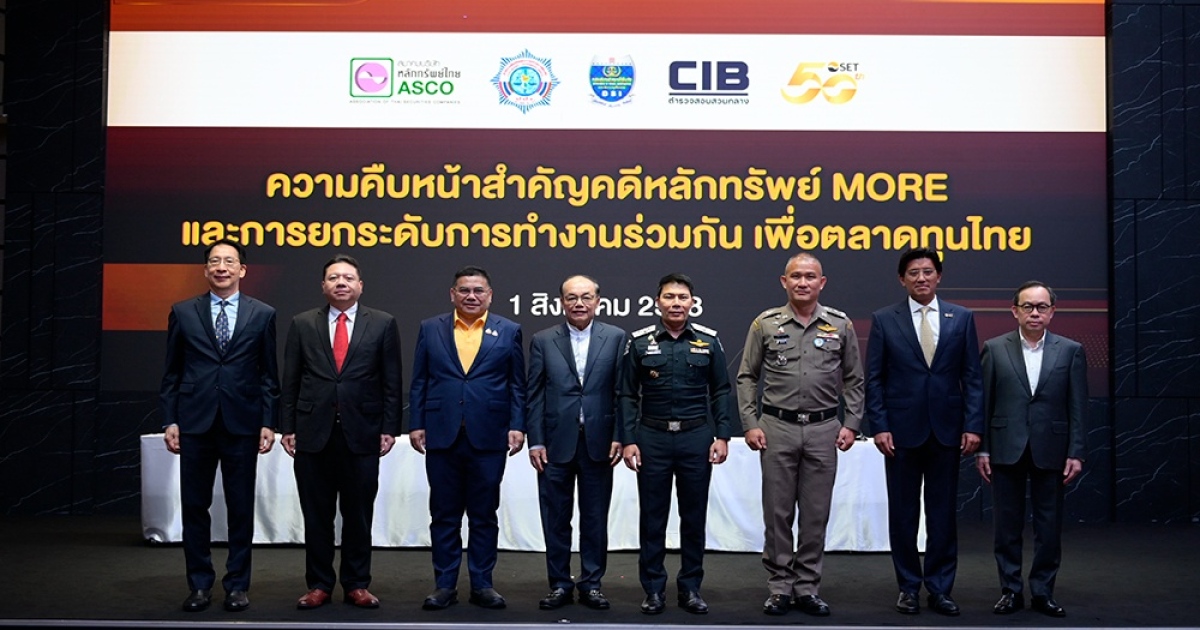 ตลาดหลักทรัพย์ฯ ร่วมกับ สำนักงานป้องกันและปราบปรามการฟอกเงิน (ปปง.) กรมสอบสวนคดีพิเศษ (DSI) กองบัญชาการตำรวจสอบสวนกลาง (บช.ก.) และสมาคมบริษัทหลักทรัพย์ไทย (ASCO) แถลงความคืบหน้าสำคัญในการดำเนินการคดีหุ้นบริษัท มอร์ รีเทิร์น จำกัด (มหาชน) ( MORE) และการยกระดับการทำงานร่วมกันเพื่อตลาดทุนไทย